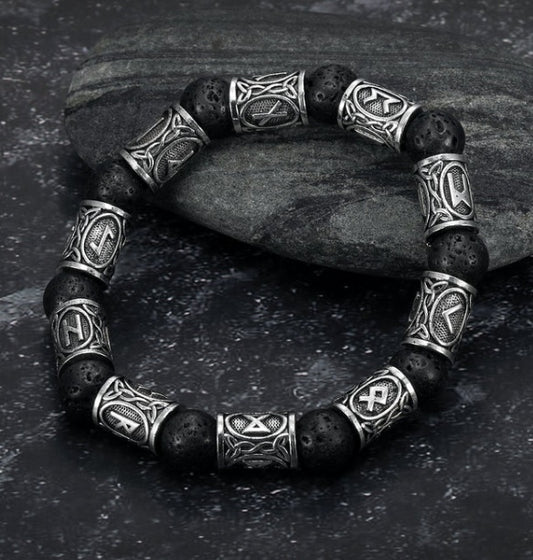 Asgard Crafted Silver Rune And Black Lava Stone Bracelet
